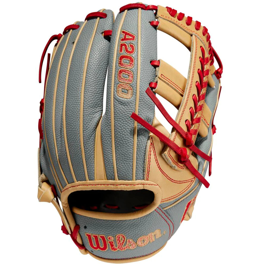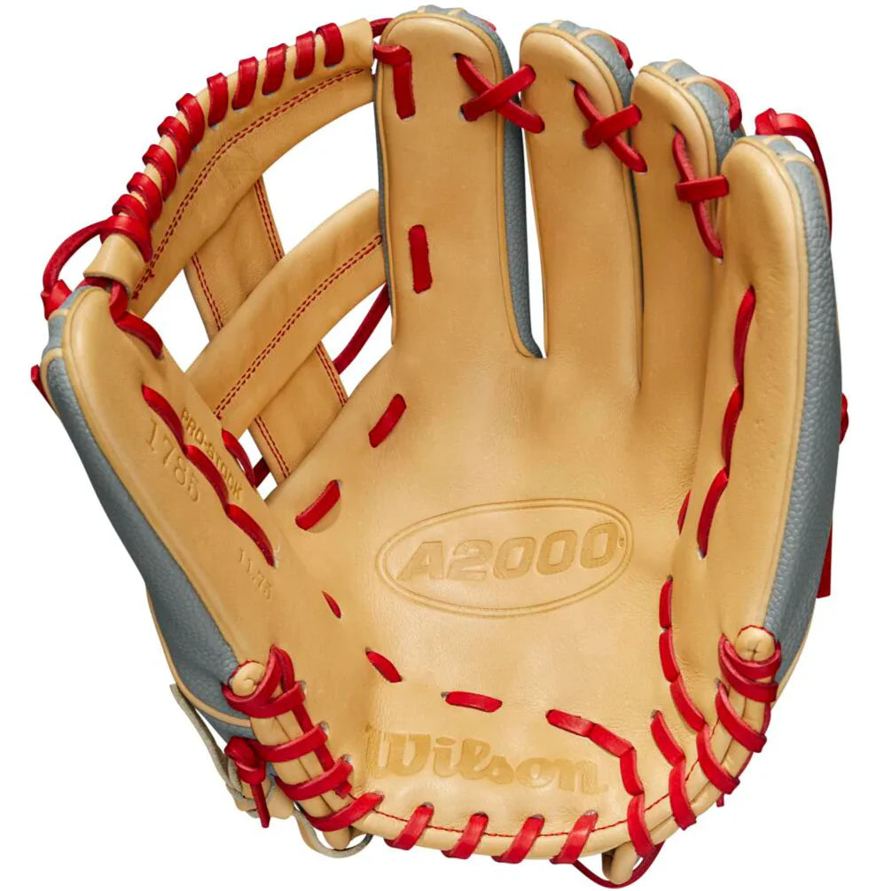Stitch up holes in the infield defense with the A2000® 1785SS, the baseball glove with a Blonde cross web and red lace baseball stitching to snatch line drives and ground balls. The Blonde Pro Stock® leather palm features a gap welting – a piece of the palm folded between the index and middle fingers – allowing for a deep, stable pocket. The glove’s Grey SuperSkin™ back reduces weight while improving durability, and gradient Bold Logos in Red and Blonde add to the modern look. At 11.75”, the A2000 1785SS offers the reach and control to make backhand plays at third or turn two up the middle.