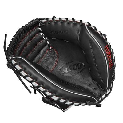 "Step up behind the plate with the Wilson A700 32.5"" Baseball Catcher’s Mitt! Engineered for adolescent and teenage catchers, this mitt offers a nearly game-ready feel, designed to keep you focused on catching strikes and blocking wild pitches. Its sleek black and white colorway, with red lining, adds a touch of style while delivering top-tier performance."