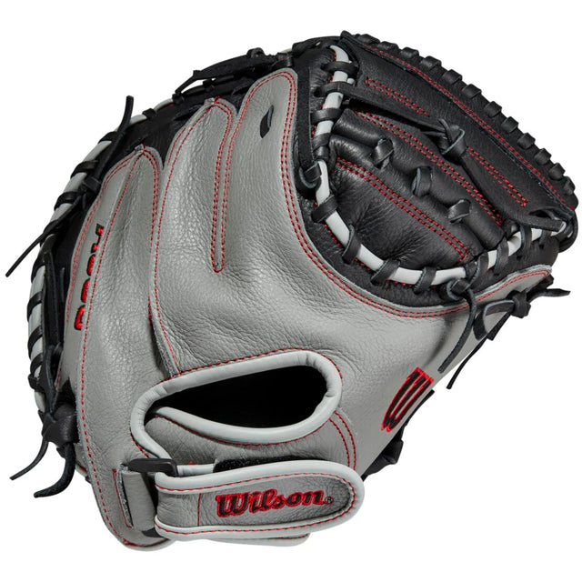 The 32” A500 baseball catcher’s mitt, ideal for youth ballplayers learning to receive and block behind home plate, features Closed One-Piece Web to corral the ball. A smaller hand opening and Velcro wrist strap helps create a secure fit for catchers, and the all-leather construction offers a sturdy and lightweight feel with Grey and Black Top Grain leather. Engineered for youth players, the A500 catcher’s mitt boasts an adjustable wrist closure for easy in-game adjustments and steady control of the glove.