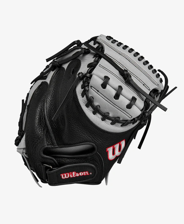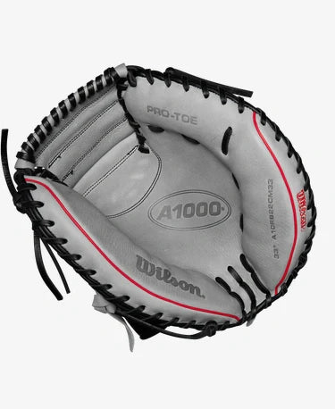 Frame perfect pitches on the edge of the strike zone with the 2024 A1000 CM33, a 33” catcher’s mitt with a deep pocket and Half Moon Web to give young players or teenage catchers total control behind the dish. Based on the professional caliber A2000® CM33 catcher’s mitt, the A1000 CM33 is handcrafted in the A2000 factory with soft, game ready Black and Grey Full Grain Leather. An adjustable Velcro wrist strap helps players create the perfect fit.