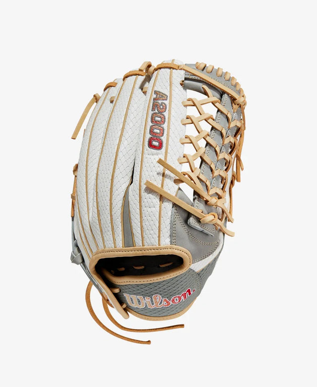 Extend from foul line to foul line and secure every fly ball with the 2023 A2000® T125SS outfield fastpitch glove. Ideal for outfielders looking to steal hits, this A2000 T125SS uses a Pro Laced T-Web to channel the ball into a deep pocket. The Grey Pro Stock leather palm offers serious durability and the comfortable feel preferred by elite players, and gap welting between the index and middle fingers stabilizes the pocket. The A2000 T125SS uses White & Grey SuperSnakeSkin™ to shed glove weight while repelling moisture from rain or wet grass, and gradient Bold Logos bring a modern appearance to the outfield.
