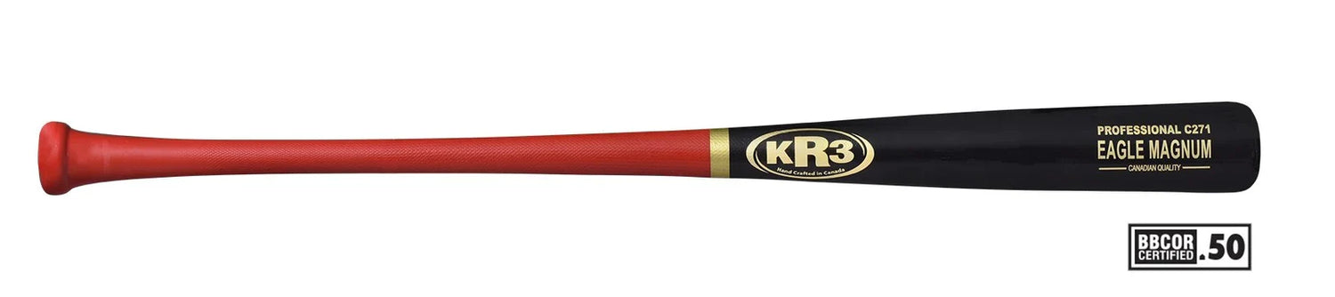 Made from our finest hand selected Maple billets, superior in bending abilities, resistant to twist and lower splitting properties. A closed grain wood coming from only our best suppliers that does not flake, thus providing higher durability. Every billet is sorted and graded on structural elements then accurately weighed to ensure excellent model consistency, especially on large barrel models. The Eagle Magnum is strengthened with fiberglass biaxial sleeving applied with our special blend of Rock Resin epoxy which was designed by the President of KR3 with over 45 years of experience in making baseball bats and launched in 2013. It was designed to provide excellent quality at this price point. All Eagle Magnums come with a 60 Day warranty against manufacturer’s defect. In house lab testing continually monitors models for exceptional performance and durability. Handcrafted Canadian Quality in each and every bat.